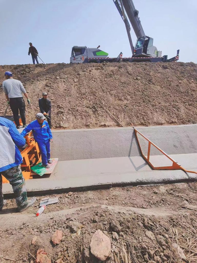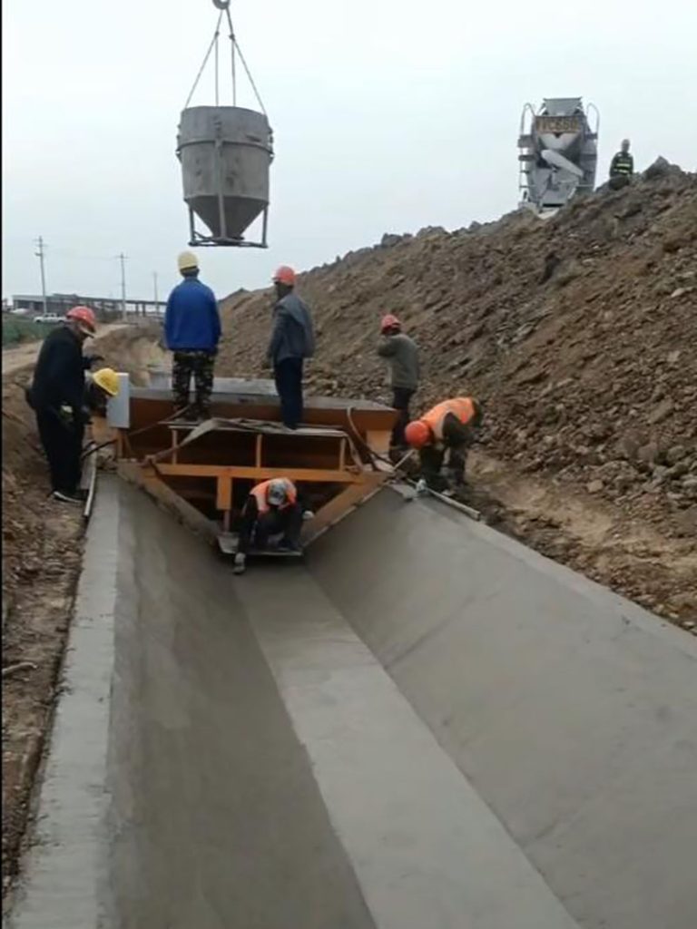 看下這個現(xiàn)場,高速公路的排水溝在公路的坡下,這就造成了增大上料花費的問題,因為坡度大,垂直高度也大。只能選擇采用吊車上料。普通的情況下如果和道路挨著,罐車是可以往機(jī)器里面卸料的。而如今這個現(xiàn)場,只能通過罐車放料到漏斗里面,吊車吊著漏斗去給機(jī)器上料。雖然有點耽誤時間,但是總體算下,使用機(jī)械施工的速度還是人工施工的好幾倍。